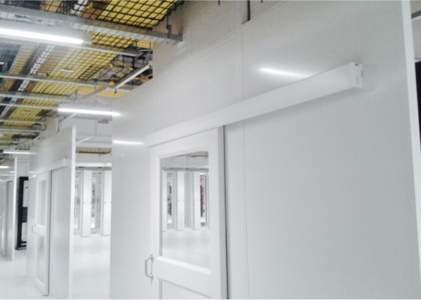 Our scope on this project was to supply and install a medium-weight aluminium ceiling system allowing the suspension of M&E services, and a modular partition system for Hot Aisle Containment in the server rooms. The Hot Aisle Containment system specially designed by Puritas allows maximum flexibility for the installation or replacement of server racks of different widths and heights within a same aisle, without any significant alteration of the containment structure.