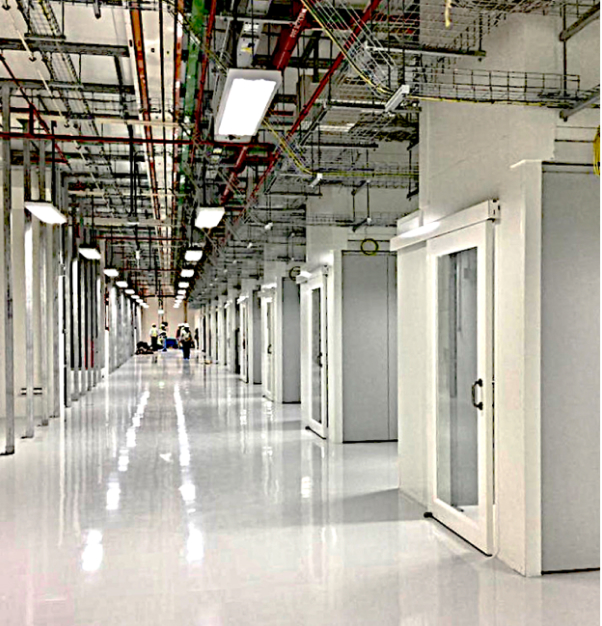 The partitions are made of 100mm thick modular sandwich panels, supported by a custom-built steel structure designed specifically for this project. Besides supporting the partitions, the structure also supports all the M&E services within the Data Hall.